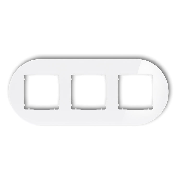 Ramka uniwersalna potrójna okrągła - efekt szkła (ramka: biała, spód: biały) w kolorze Efekt Szkła - Białym to dekoracyjna ramka potrójna w okrągłym kształcie, wykonana z materiału dającego efekt szkła. Służy do estetycznego wykończenia osprzętu elektrycznego, takiego jak włączniki czy gniazdka. Kolorystyka ramki i spodniej części sprawia, że całość prezentuje się nowocześnie i elegancko, pasując do różnych aranżacji wnętrz.