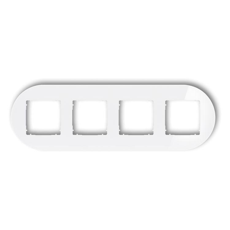 Ramka uniwersalna poczwórna okrągła - efekt szkła (ramka: biała, spód: biały) w kolorze Efekt Szkła - Białym to dekoracyjna ramka poczwórna w okrągłym kształcie, wykonana z materiału dającego efekt szkła. Służy do estetycznego wykończenia osprzętu elektrycznego, takiego jak włączniki czy gniazdka. Kolorystyka ramki i spodniej części sprawia, że całość prezentuje się nowocześnie i elegancko, pasując do różnych aranżacji wnętrz.