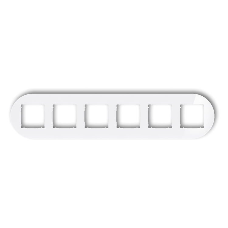 Ramka uniwersalna sześciokrotna okrągła - efekt szkła (ramka: biała, spód: biały) w kolorze Efekt Szkła - Białym to dekoracyjna ramka sześciokrotna w okrągłym kształcie, wykonana z materiału dającego efekt szkła. Służy do estetycznego wykończenia osprzętu elektrycznego, takiego jak włączniki czy gniazdka. Kolorystyka ramki i spodniej części sprawia, że całość prezentuje się nowocześnie i elegancko, pasując do różnych aranżacji wnętrz.