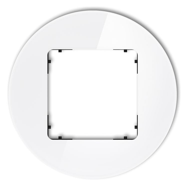 Ramka uniwersalna pojedyncza okrągła - efekt szkła (ramka: biała, spód: czarny) w kolorze Efekt Szkła - Białym to dekoracyjna ramka pojedyncza w okrągłym kształcie, wykonana z materiału dającego efekt szkła. Służy do estetycznego wykończenia osprzętu elektrycznego, takiego jak włączniki czy gniazdka. Kolorystyka ramki i spodniej części sprawia, że całość prezentuje się nowocześnie i elegancko, pasując do różnych aranżacji wnętrz.