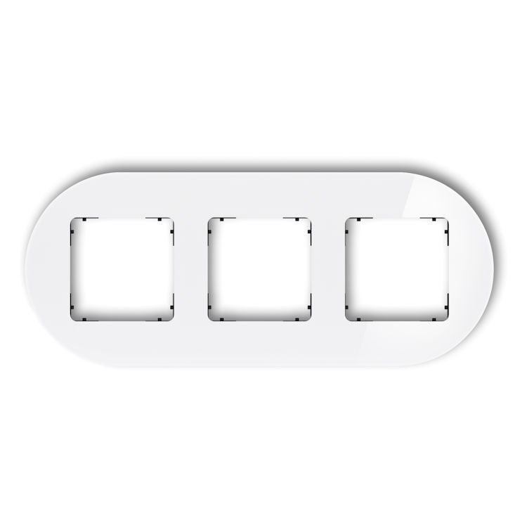 Ramka uniwersalna potrójna okrągła - efekt szkła (ramka: biała, spód: czarny) w kolorze Efekt Szkła - Białym to dekoracyjna ramka potrójna w okrągłym kształcie, wykonana z materiału dającego efekt szkła. Służy do estetycznego wykończenia osprzętu elektrycznego, takiego jak włączniki czy gniazdka. Kolorystyka ramki i spodniej części sprawia, że całość prezentuje się nowocześnie i elegancko, pasując do różnych aranżacji wnętrz.