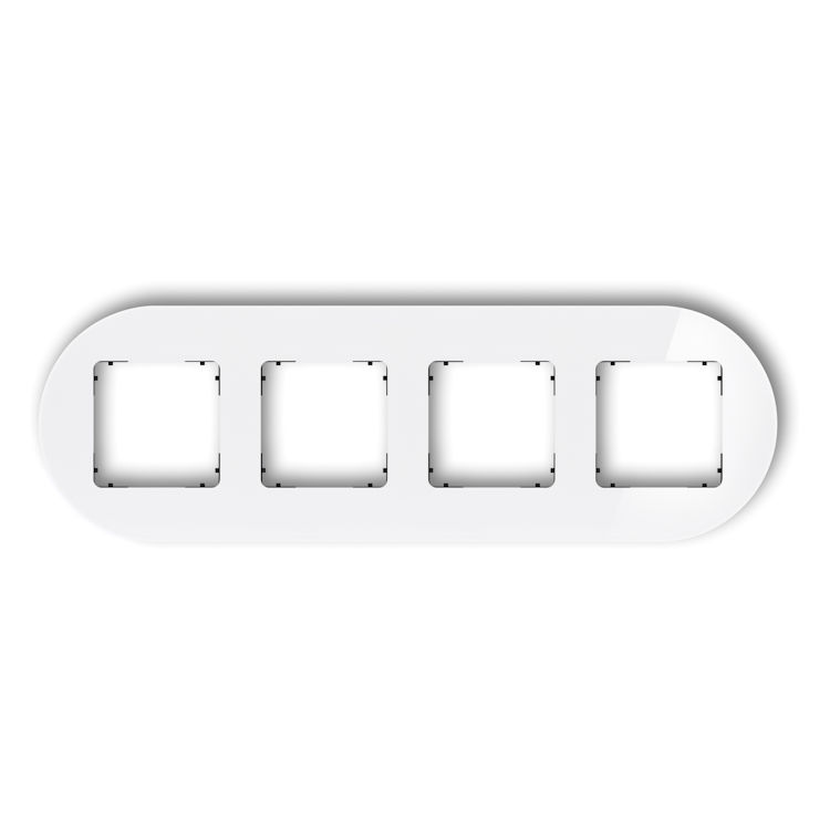 Ramka uniwersalna poczwórna okrągła - efekt szkła (ramka: biała, spód: czarny) w kolorze Efekt Szkła - Białym to dekoracyjna ramka poczwórna w okrągłym kształcie, wykonana z materiału dającego efekt szkła. Służy do estetycznego wykończenia osprzętu elektrycznego, takiego jak włączniki czy gniazdka. Kolorystyka ramki i spodniej części sprawia, że całość prezentuje się nowocześnie i elegancko, pasując do różnych aranżacji wnętrz.