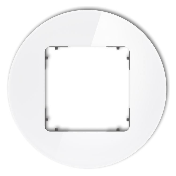 Ramka uniwersalna pojedyncza okrągła - efekt szkła (ramka: biała, spód: grafitowy mat) w kolorze Efekt Szkła - Białym to dekoracyjna ramka pojedyncza w okrągłym kształcie, wykonana z materiału dającego efekt szkła. Służy do estetycznego wykończenia osprzętu elektrycznego, takiego jak włączniki czy gniazdka. Kolorystyka ramki i spodniej części sprawia, że całość prezentuje się nowocześnie i elegancko, pasując do różnych aranżacji wnętrz.