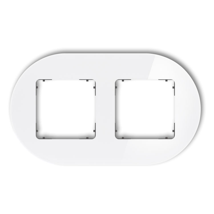Dekoracyjna ramka podwójna w okrągłym kształcie, wykonana z materiału dającego efekt szkła. Służy do estetycznego wykończenia osprzętu elektrycznego, takiego jak włączniki czy gniazdka. Kolorystyka ramki i spodniej części sprawia, że całość prezentuje się nowocześnie i elegancko, pasując do różnych aranżacji wnętrz.