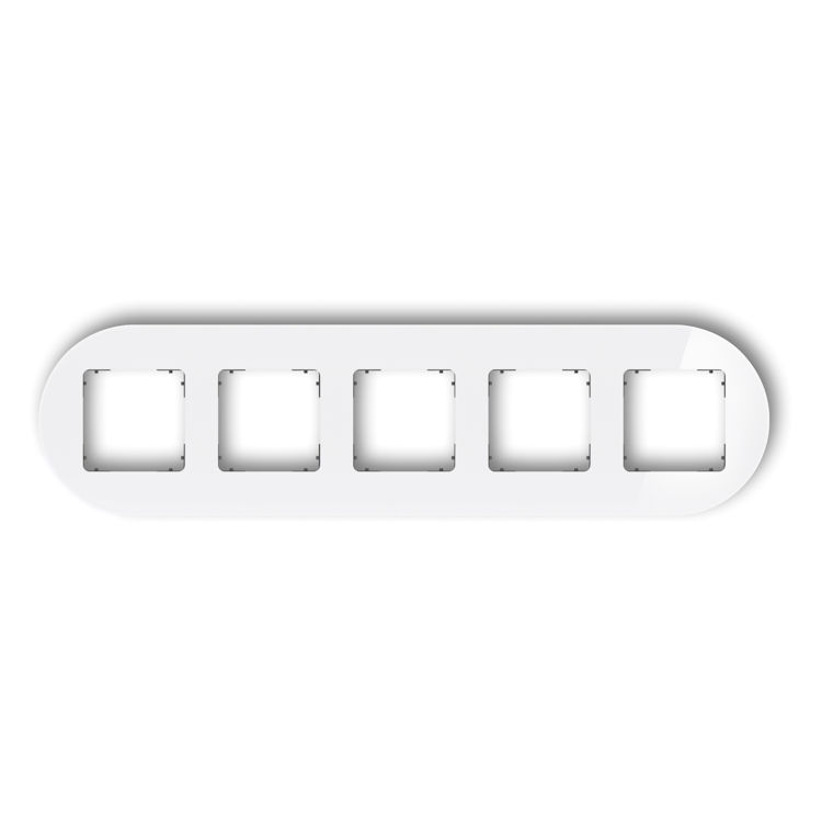 Ramka uniwersalna pięciokrotna okrągła - efekt szkła (ramka: biała, spód: grafitowy mat) w kolorze Efekt Szkła - Białym to dekoracyjna ramka pięciokrotna w okrągłym kształcie, wykonana z materiału dającego efekt szkła. Służy do estetycznego wykończenia osprzętu elektrycznego, takiego jak włączniki czy gniazdka. Kolorystyka ramki i spodniej części sprawia, że całość prezentuje się nowocześnie i elegancko, pasując do różnych aranżacji wnętrz.