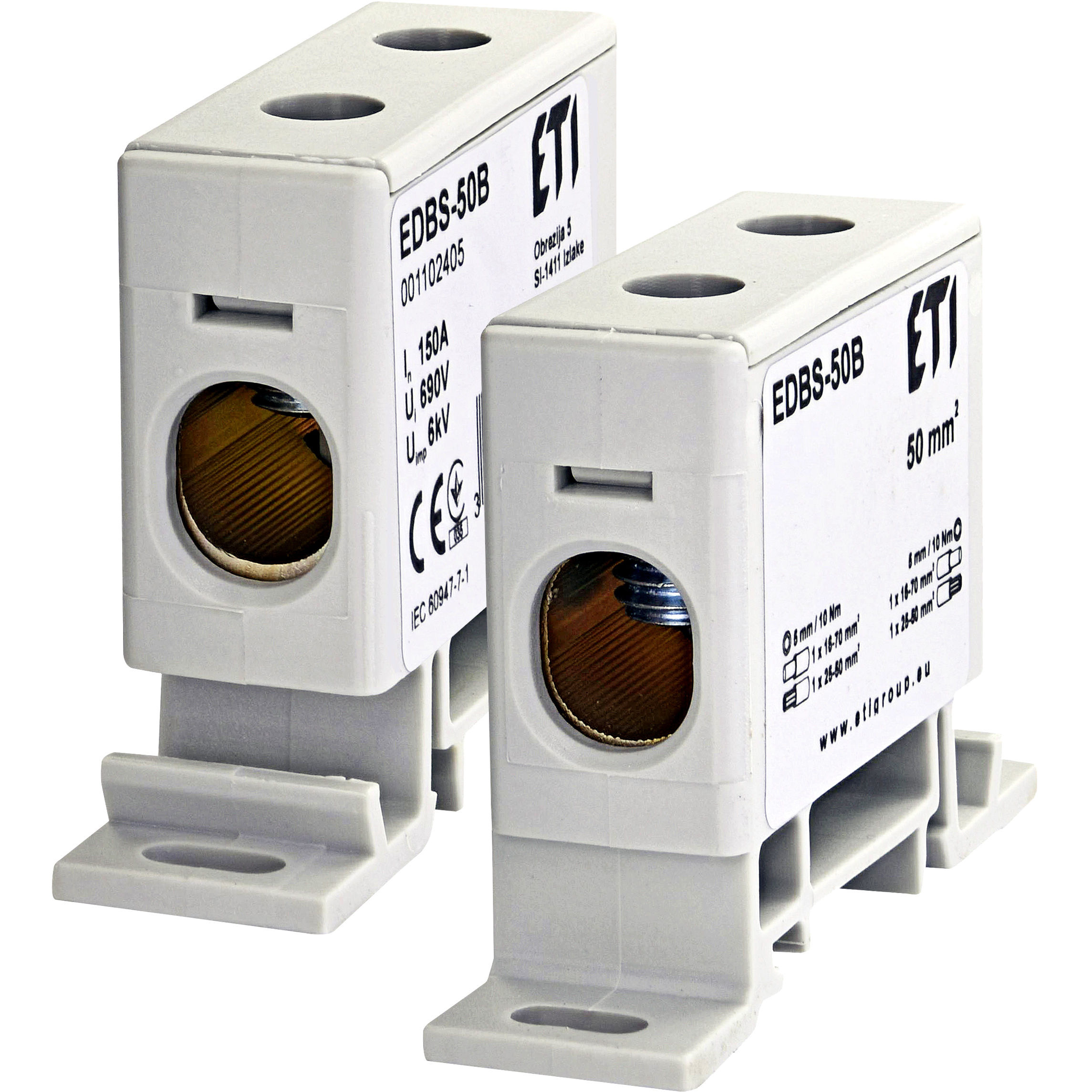 Zacisk 1-torowy Eti EDBS-50B 150A 16–70mm² na szynę TH szary – pewne i trwałe połączenia przewodów