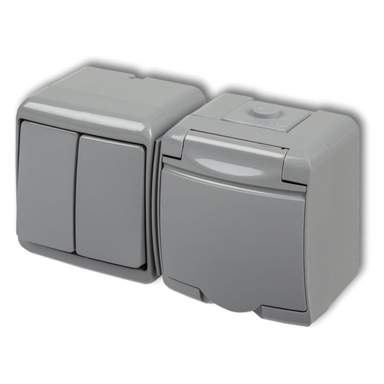 Połączenie łącznika świecznikowego z pojedynczym gniazdem z uziemieniem, które umożliwia niezależne sterowanie dwoma źródłami światła oraz podłączenie urządzenia elektrycznego w jednym punkcie. Wyposażone jest w białą klapkę ochronną, zabezpieczającą wnętrze gniazda przed kurzem i przypadkowym dotknięciem styków.