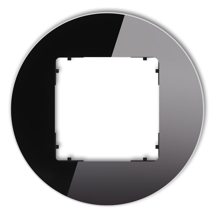 Ramka uniwersalna pojedyncza okrągła - efekt szkła (ramka: czarna, spód: czarny) w kolorze Efekt Szkła - Czarnym to dekoracyjna ramka pojedyncza w okrągłym kształcie, wykonana z materiału dającego efekt szkła. Służy do estetycznego wykończenia osprzętu elektrycznego, takiego jak włączniki czy gniazdka. Kolorystyka ramki i spodniej części sprawia, że całość prezentuje się nowocześnie i elegancko, pasując do różnych aranżacji wnętrz.