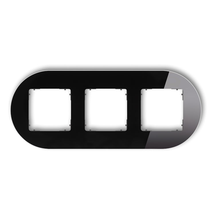 Ramka uniwersalna potrójna okrągła - efekt szkła (ramka: czarna, spód: grafitowy mat) w kolorze Efekt Szkła - Czarnym to dekoracyjna ramka potrójna w okrągłym kształcie, wykonana z materiału dającego efekt szkła. Służy do estetycznego wykończenia osprzętu elektrycznego, takiego jak włączniki czy gniazdka. Kolorystyka ramki i spodniej części sprawia, że całość prezentuje się nowocześnie i elegancko, pasując do różnych aranżacji wnętrz.