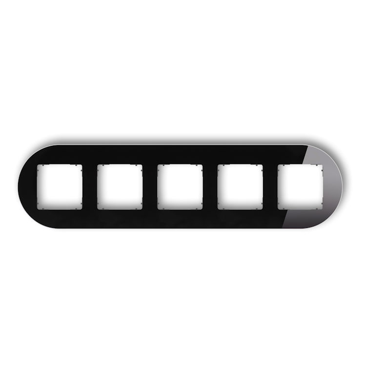 Ramka uniwersalna pięciokrotna okrągła - efekt szkła (ramka: czarna, spód: grafitowy mat) w kolorze Efekt Szkła - Czarnym to dekoracyjna ramka pięciokrotna w okrągłym kształcie, wykonana z materiału dającego efekt szkła. Służy do estetycznego wykończenia osprzętu elektrycznego, takiego jak włączniki czy gniazdka. Kolorystyka ramki i spodniej części sprawia, że całość prezentuje się nowocześnie i elegancko, pasując do różnych aranżacji wnętrz.