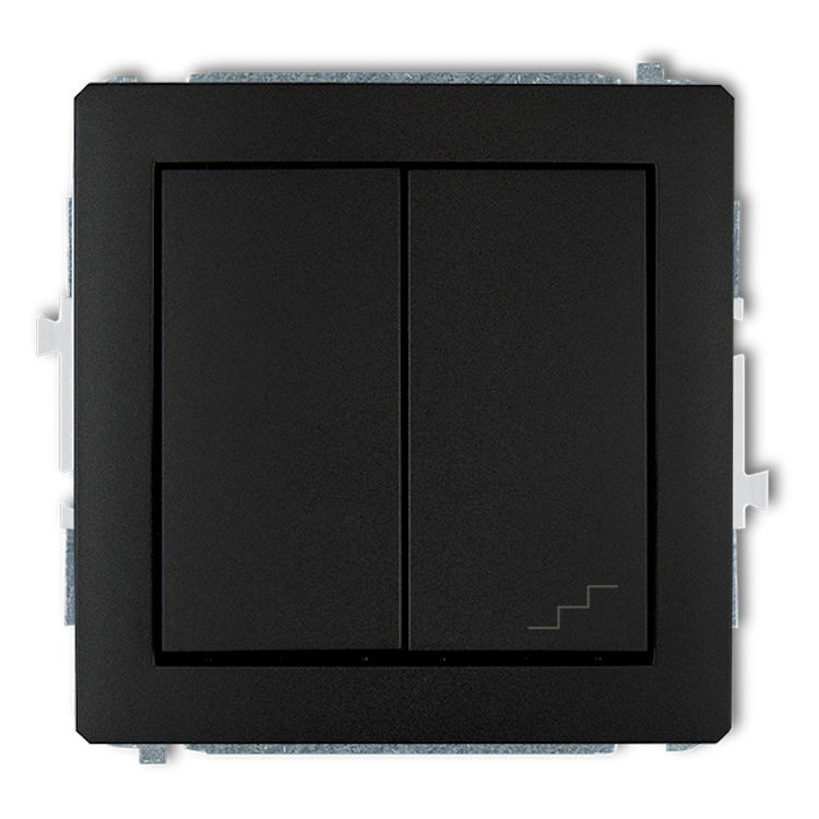 Mechanizm łącznika jednobiegunowego ze schodowym (wspólne zasilanie) w kolorze Czarnym Mat to mechanizm łącznika, który łączy w sobie funkcję zwykłego włącznika światła oraz schodowego. Dzięki temu można sterować jednym źródłem oświetlenia z dwóch różnych miejsc, na przykład z dołu i góry schodów. Rozwiązanie to zapewnia wygodę w codziennym użytkowaniu i oszczędność miejsca, ponieważ jeden mechanizm spełnia dwie role.