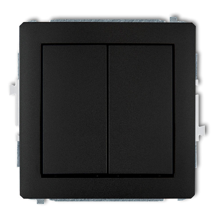 Mechanizm łącznika jednobiegunowego ze schodowym (dwa klawisze bez piktogramów, wspólne zasilanie) w kolorze Czarnym Mat to mechanizm łącznika, który łączy w sobie funkcję zwykłego włącznika światła oraz schodowego. Dzięki temu można sterować jednym źródłem oświetlenia z dwóch różnych miejsc, na przykład z dołu i góry schodów. Rozwiązanie to zapewnia wygodę w codziennym użytkowaniu i oszczędność miejsca, ponieważ jeden mechanizm spełnia dwie role.