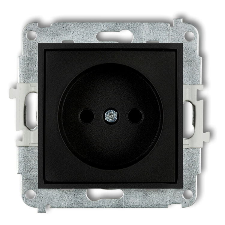Mechanizm gniazda pojedynczego bez uziemienia 2P (przesłony torów prądowych) w kolorze Czarnym Mat to pojedyncze gniazdo elektryczne bez uziemienia, przeznaczone do podłączania urządzeń niewymagających dodatkowej ochrony. Wyposażone jest w przesłony torów prądowych, które zasłaniają otwory, gdy nie ma wtyczki. Dzięki temu korzystanie z gniazda jest bezpieczniejsze, zwłaszcza w miejscach, gdzie przebywają dzieci.