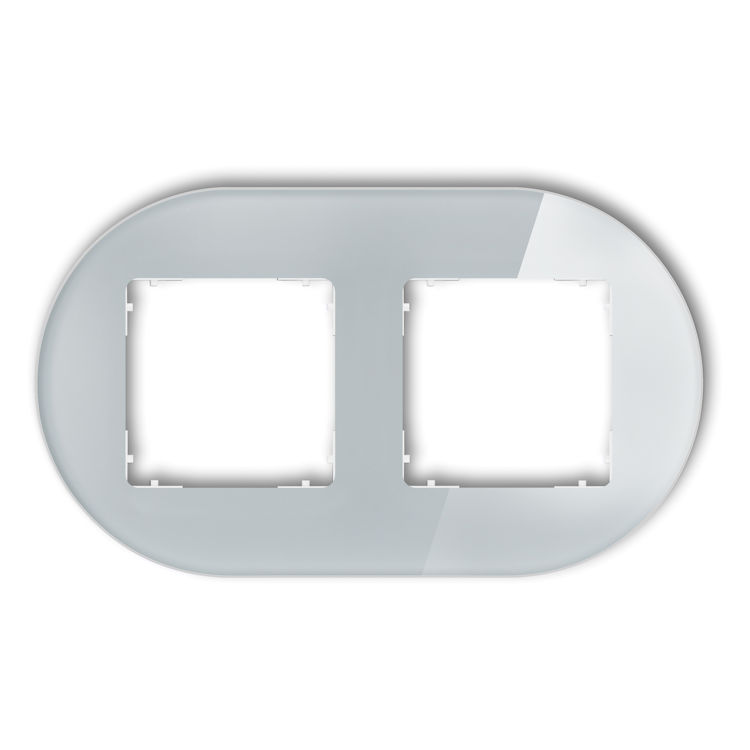 Dekoracyjna ramka podwójna w okrągłym kształcie, wykonana z materiału dającego efekt szkła. Służy do estetycznego wykończenia osprzętu elektrycznego, takiego jak włączniki czy gniazdka. Kolorystyka ramki i spodniej części sprawia, że całość prezentuje się nowocześnie i elegancko, pasując do różnych aranżacji wnętrz.
