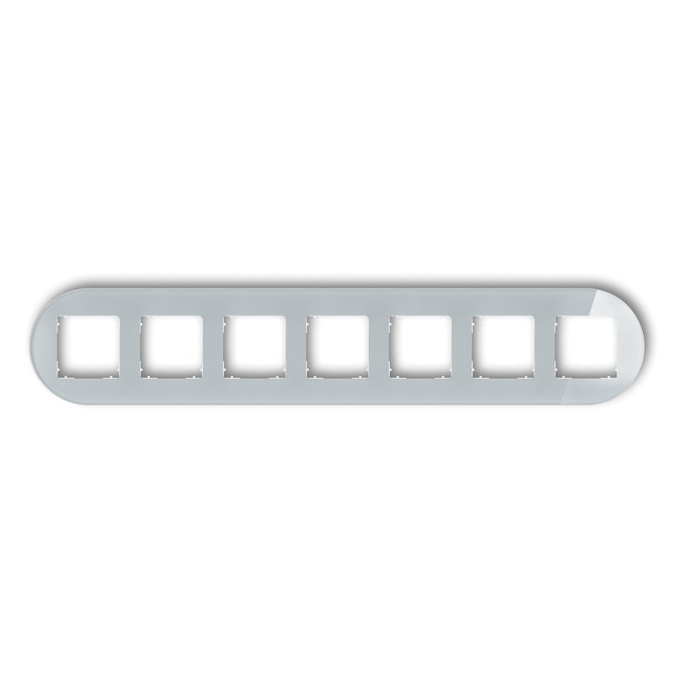 Dekoracyjna ramka siedmiokrotna w okrągłym kształcie, wykonana z materiału dającego efekt szkła. Służy do estetycznego wykończenia osprzętu elektrycznego, takiego jak włączniki czy gniazdka. Kolorystyka ramki i spodniej części sprawia, że całość prezentuje się nowocześnie i elegancko, pasując do różnych aranżacji wnętrz.