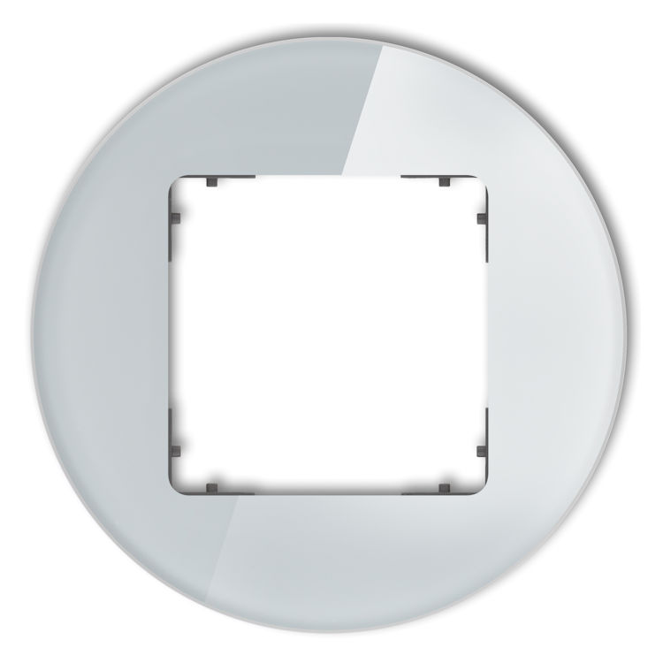Dekoracyjna ramka pojedyncza w okrągłym kształcie, wykonana z materiału dającego efekt szkła. Służy do estetycznego wykończenia osprzętu elektrycznego, takiego jak włączniki czy gniazdka. Kolorystyka ramki i spodniej części sprawia, że całość prezentuje się nowocześnie i elegancko, pasując do różnych aranżacji wnętrz.