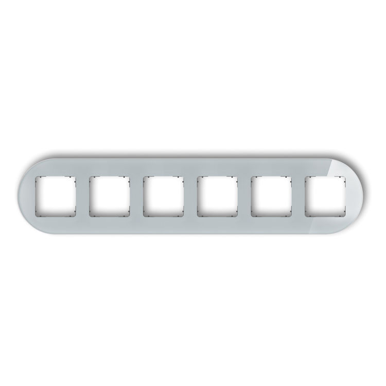 Dekoracyjna ramka sześciokrotna w okrągłym kształcie, wykonana z materiału dającego efekt szkła. Służy do estetycznego wykończenia osprzętu elektrycznego, takiego jak włączniki czy gniazdka. Kolorystyka ramki i spodniej części sprawia, że całość prezentuje się nowocześnie i elegancko, pasując do różnych aranżacji wnętrz.