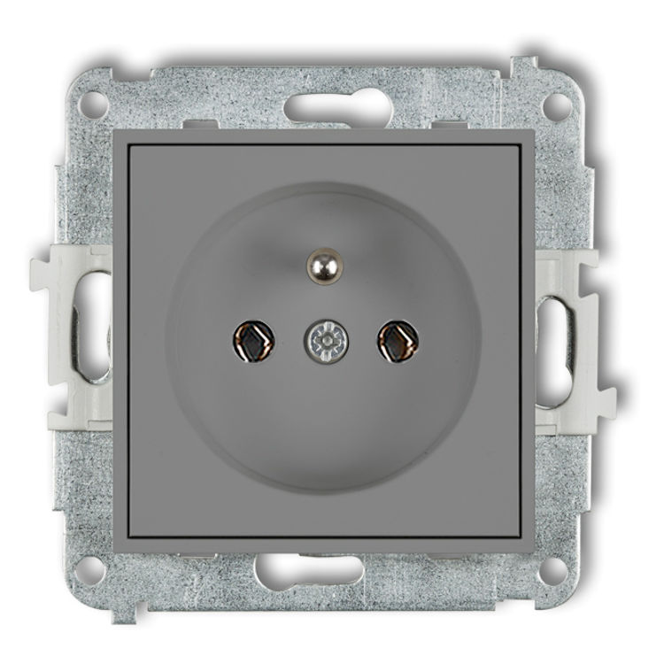 Mechanizm gniazda pojedynczego z uziemieniem 2P+Z (bez przesłon torów prądowych) w kolorze Szarym Mat to pojedyncze gniazdo elektryczne z uziemieniem, które zapewnia dodatkową ochronę podczas korzystania ze sprzętów podłączonych do prądu. Posiada dwa otwory na wtyczkę oraz bolec uziemiający, który zwiększa bezpieczeństwo użytkowania. Brak przesłon oznacza, że otwory są cały czas odsłonięte, dlatego zaleca się montaż w miejscach, gdzie nie ma małych dzieci.