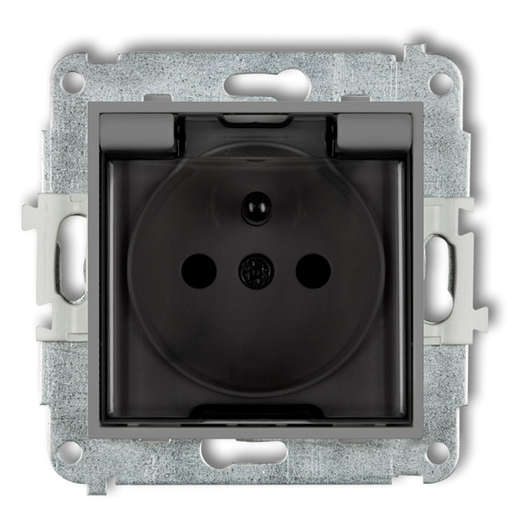 Pojedyncze gniazdo elektryczne z uziemieniem, wyposażone w klapkę w kolorze dymnym, która chroni je przed zachlapaniem wodą. Dzięki temu można je bezpiecznie stosować w pomieszczeniach narażonych na wilgoć, takich jak łazienka, kuchnia czy garaż. Dodatkowe przesłony torów prądowych zasłaniają otwory, gdy gniazdo nie jest używane.