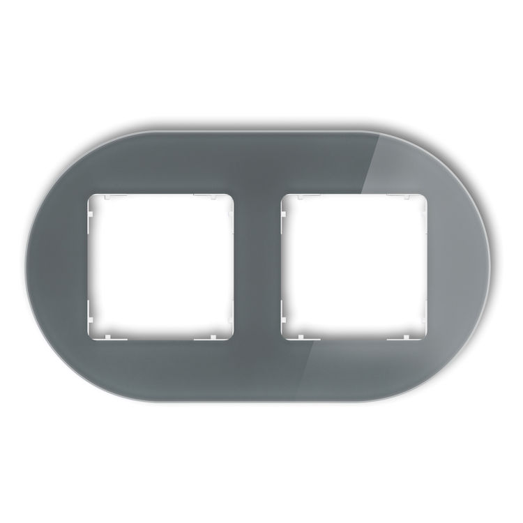 Dekoracyjna ramka podwójna w okrągłym kształcie, wykonana z materiału dającego efekt szkła. Służy do estetycznego wykończenia osprzętu elektrycznego, takiego jak włączniki czy gniazdka. Kolorystyka ramki i spodniej części sprawia, że całość prezentuje się nowocześnie i elegancko, pasując do różnych aranżacji wnętrz.