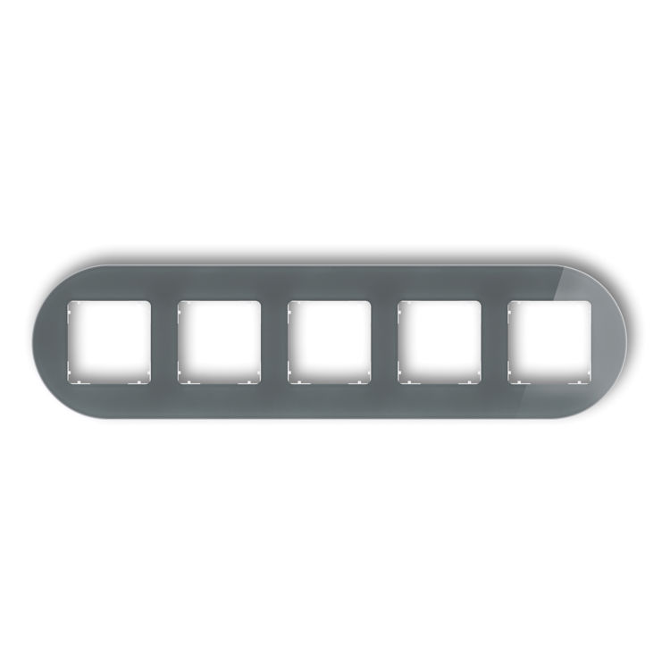 Dekoracyjna ramka pięciokrotna w okrągłym kształcie, wykonana z materiału dającego efekt szkła. Służy do estetycznego wykończenia osprzętu elektrycznego, takiego jak włączniki czy gniazdka. Kolorystyka ramki i spodniej części sprawia, że całość prezentuje się nowocześnie i elegancko, pasując do różnych aranżacji wnętrz.