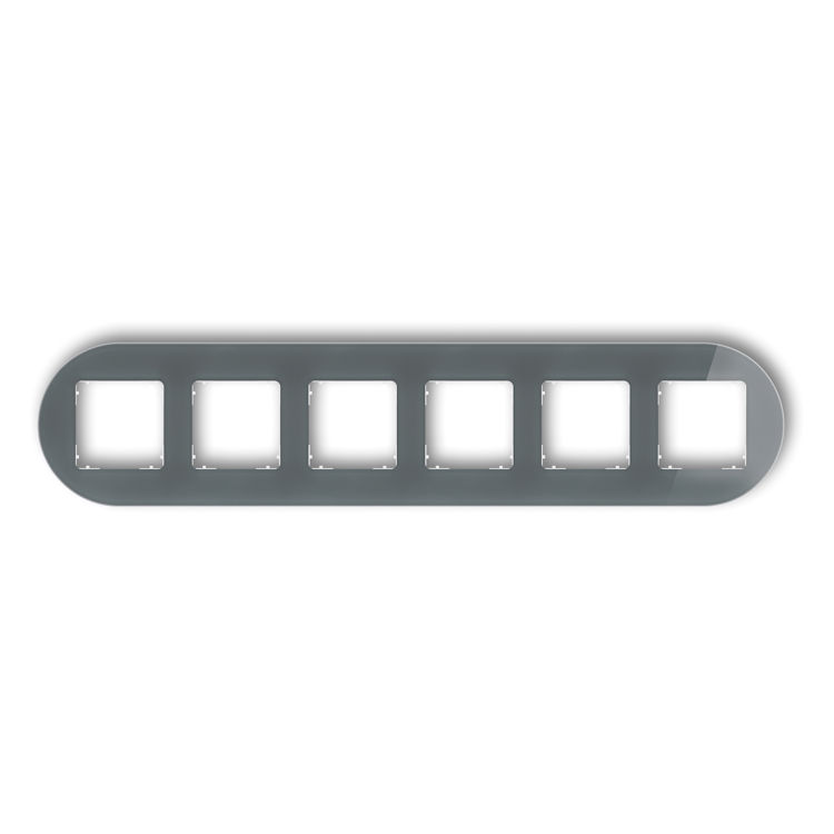 Ramka uniwersalna sześciokrotna okrągła - efekt szkła (ramka: grafitowa, spód: biały) w kolorze Efekt Szkła - Grafitowym to dekoracyjna ramka sześciokrotna w okrągłym kształcie, wykonana z materiału dającego efekt szkła. Służy do estetycznego wykończenia osprzętu elektrycznego, takiego jak włączniki czy gniazdka. Kolorystyka ramki i spodniej części sprawia, że całość prezentuje się nowocześnie i elegancko, pasując do różnych aranżacji wnętrz.