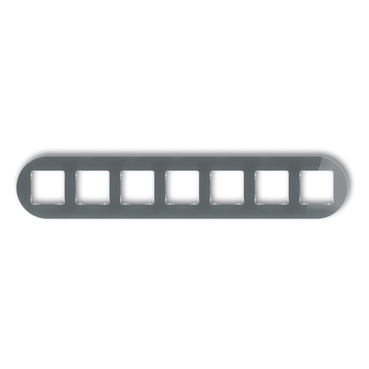 Dekoracyjna ramka siedmiokrotna w okrągłym kształcie, wykonana z materiału dającego efekt szkła. Służy do estetycznego wykończenia osprzętu elektrycznego, takiego jak włączniki czy gniazdka. Kolorystyka ramki i spodniej części sprawia, że całość prezentuje się nowocześnie i elegancko, pasując do różnych aranżacji wnętrz.