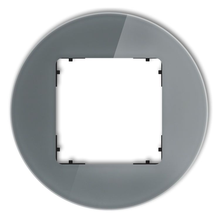 Ramka uniwersalna pojedyncza okrągła - efekt szkła (ramka: grafitowa, spód: czarny) w kolorze Efekt Szkła - Grafitowym to dekoracyjna ramka pojedyncza w okrągłym kształcie, wykonana z materiału dającego efekt szkła. Służy do estetycznego wykończenia osprzętu elektrycznego, takiego jak włączniki czy gniazdka. Kolorystyka ramki i spodniej części sprawia, że całość prezentuje się nowocześnie i elegancko, pasując do różnych aranżacji wnętrz.
