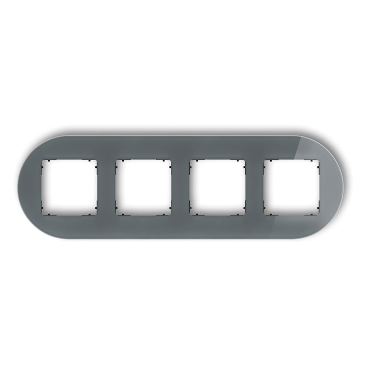 Ramka uniwersalna poczwórna okrągła - efekt szkła (ramka: grafitowa, spód: czarny) w kolorze Efekt Szkła - Grafitowym to dekoracyjna ramka poczwórna w okrągłym kształcie, wykonana z materiału dającego efekt szkła. Służy do estetycznego wykończenia osprzętu elektrycznego, takiego jak włączniki czy gniazdka. Kolorystyka ramki i spodniej części sprawia, że całość prezentuje się nowocześnie i elegancko, pasując do różnych aranżacji wnętrz.
