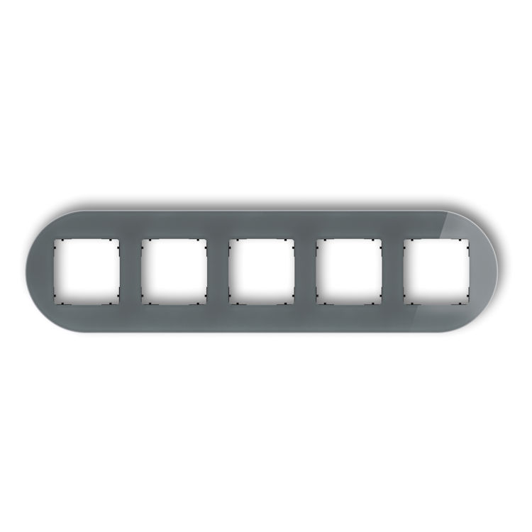 Ramka uniwersalna pięciokrotna okrągła - efekt szkła (ramka: grafitowa, spód: czarny) w kolorze Efekt Szkła - Grafitowym to dekoracyjna ramka pięciokrotna w okrągłym kształcie, wykonana z materiału dającego efekt szkła. Służy do estetycznego wykończenia osprzętu elektrycznego, takiego jak włączniki czy gniazdka. Kolorystyka ramki i spodniej części sprawia, że całość prezentuje się nowocześnie i elegancko, pasując do różnych aranżacji wnętrz.