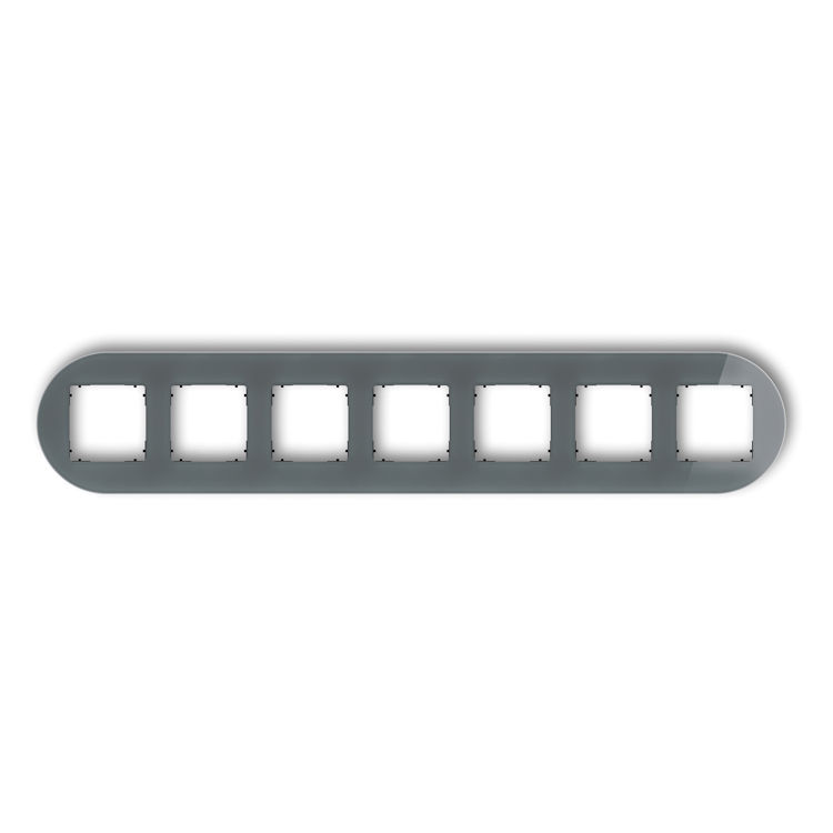 Dekoracyjna ramka siedmiokrotna w okrągłym kształcie, wykonana z materiału dającego efekt szkła. Służy do estetycznego wykończenia osprzętu elektrycznego, takiego jak włączniki czy gniazdka. Kolorystyka ramki i spodniej części sprawia, że całość prezentuje się nowocześnie i elegancko, pasując do różnych aranżacji wnętrz.