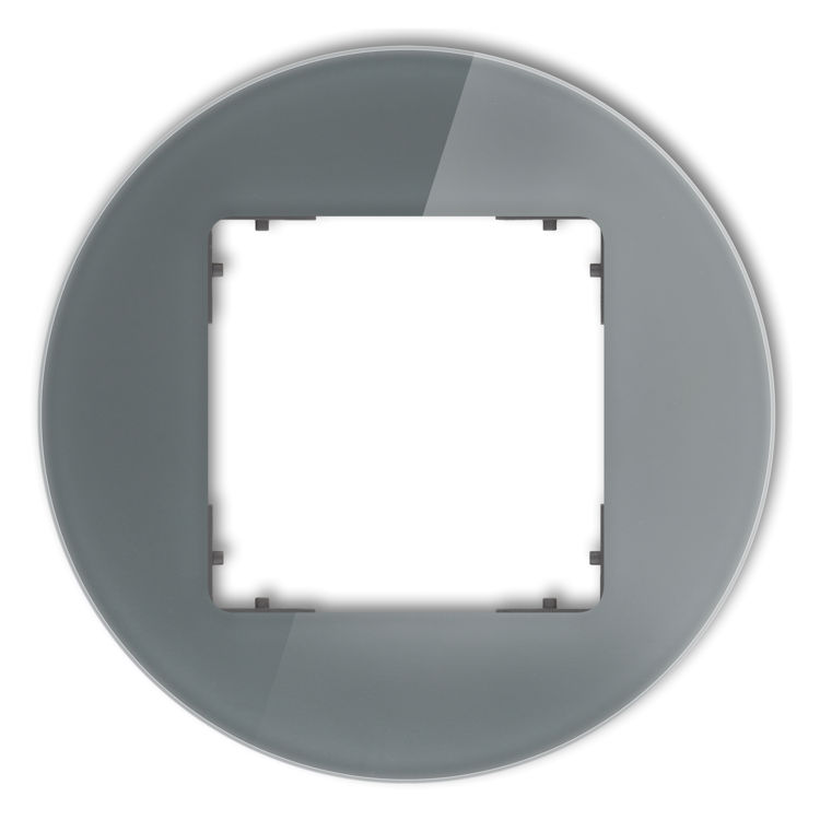 Dekoracyjna ramka pojedyncza w okrągłym kształcie, wykonana z materiału dającego efekt szkła. Służy do estetycznego wykończenia osprzętu elektrycznego, takiego jak włączniki czy gniazdka. Kolorystyka ramki i spodniej części sprawia, że całość prezentuje się nowocześnie i elegancko, pasując do różnych aranżacji wnętrz.