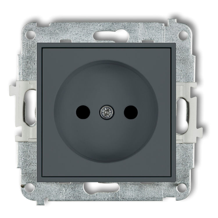 Mechanizm gniazda pojedynczego bez uziemienia 2P (przesłony torów prądowych) w kolorze Grafitowym Mat to pojedyncze gniazdo elektryczne bez uziemienia, przeznaczone do podłączania urządzeń niewymagających dodatkowej ochrony. Wyposażone jest w przesłony torów prądowych, które zasłaniają otwory, gdy nie ma wtyczki. Dzięki temu korzystanie z gniazda jest bezpieczniejsze, zwłaszcza w miejscach, gdzie przebywają dzieci.