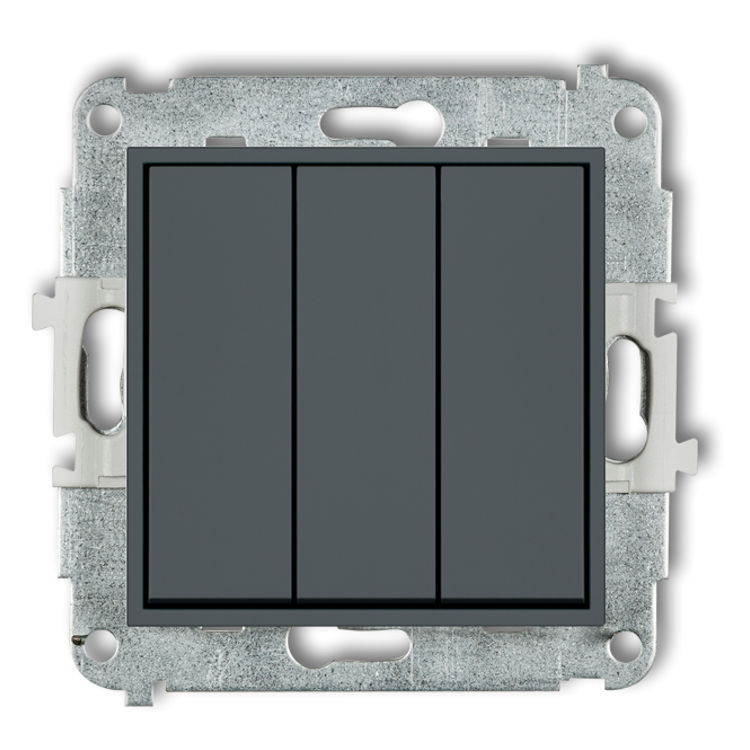 Mechanizm łącznika potrójnego w kolorze Grafitowym Mat to łącznik z trzema niezależnymi klawiszami, który pozwala sterować trzema różnymi źródłami światła lub trzema obwodami w jednym pomieszczeniu. Dzięki niemu można włączać i wyłączać każde światło osobno albo kilka naraz, w zależności od potrzeb. To wygodne rozwiązanie, gdy w jednym miejscu znajduje się kilka punktów oświetleniowych, np. główna lampa i dodatkowe kinkiety