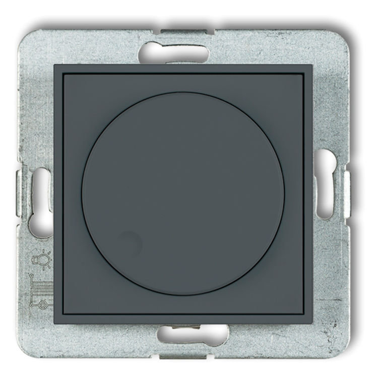 Mechanizm elektronicznego regulatora oświetlenia przyciskowo-obrotowego w kolorze Grafitowym Mat to elektroniczny regulator oświetlenia przyciskowo-obrotowy (ściemniacz), umożliwiający bezstopniową regulację natężenia światła od 0 do 100% mocy oświetlenia, przy użyciu praktycznie każdej oprawy. Poszerza w ten sposób komfort i codzienną oszczędność energii elektrycznej, której zużycie jest proporcjonalne do poziomu oświetlenia. Układ poprawia intuicyjność sterowania systemami oświetleniowymi, dając komfort, wygodę i oszczędność w użytkowaniu.