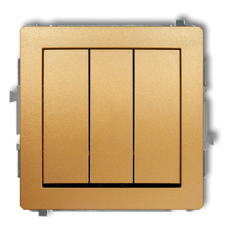 Mechanizm łącznika potrójnego w kolorze Złotym to mechanizm łącznika, który umożliwia sterowanie trzema niezależnymi obwodami oświetleniowymi z jednego miejsca. Dzięki niemu można osobno włączać i wyłączać różne źródła światła, co pozwala dopasować oświetlenie do aktualnych potrzeb. Rozwiązanie to zapewnia wygodę i oszczędność miejsca, ponieważ zastępuje trzy oddzielne włączniki jednym mechanizmem.