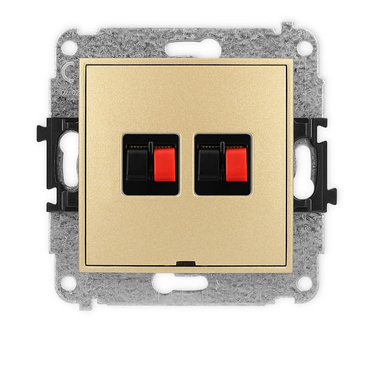 Mechanizm gniazda głośnikowego podwójnego, bez pola opisowego w kolorze Złotym to gniazdo przeznaczone do podłączenia dwóch głośników przewodowych. Ułatwia podłączenie i odłączenie kabli, zapewniając stabilne i pewne połączenie bez ryzyka ich wysuwania się. Dzięki temu można w estetyczny i wygodny sposób zorganizować domową instalację audio.