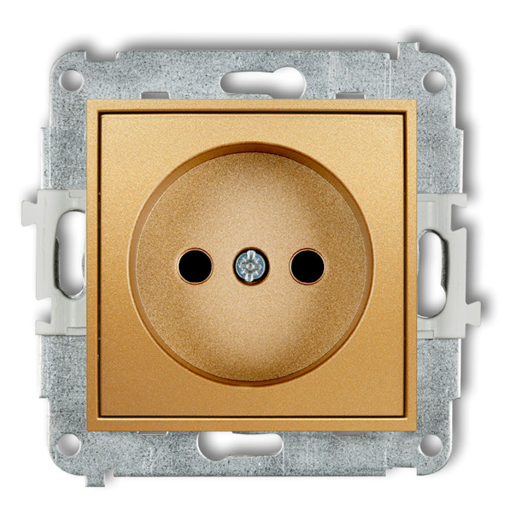 Mechanizm gniazda pojedynczego bez uziemienia 2P (przesłony torów prądowych) w kolorze Złotym to pojedyncze gniazdo elektryczne bez uziemienia, przeznaczone do podłączania urządzeń niewymagających dodatkowej ochrony. Wyposażone jest w przesłony torów prądowych, które zasłaniają otwory, gdy nie ma wtyczki. Dzięki temu korzystanie z gniazda jest bezpieczniejsze, zwłaszcza w miejscach, gdzie przebywają dzieci.