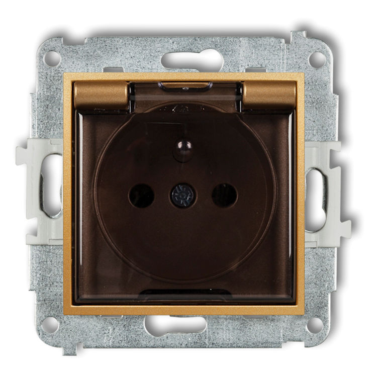 Mechanizm gniazda bryzgoszczelnego z uziemieniem 2P+Z (klapka dymna, przesłony torów prądowych) w kolorze Złotym to pojedyncze gniazdo elektryczne z uziemieniem, wyposażone w klapkę w kolorze dymnym, która chroni je przed zachlapaniem wodą. Dzięki temu można je bezpiecznie stosować w pomieszczeniach narażonych na wilgoć, takich jak łazienka, kuchnia czy garaż. Dodatkowe przesłony torów prądowych zasłaniają otwory, gdy gniazdo nie jest używane, co zwiększa bezpieczeństwo, zwłaszcza w domach z dziećmi.