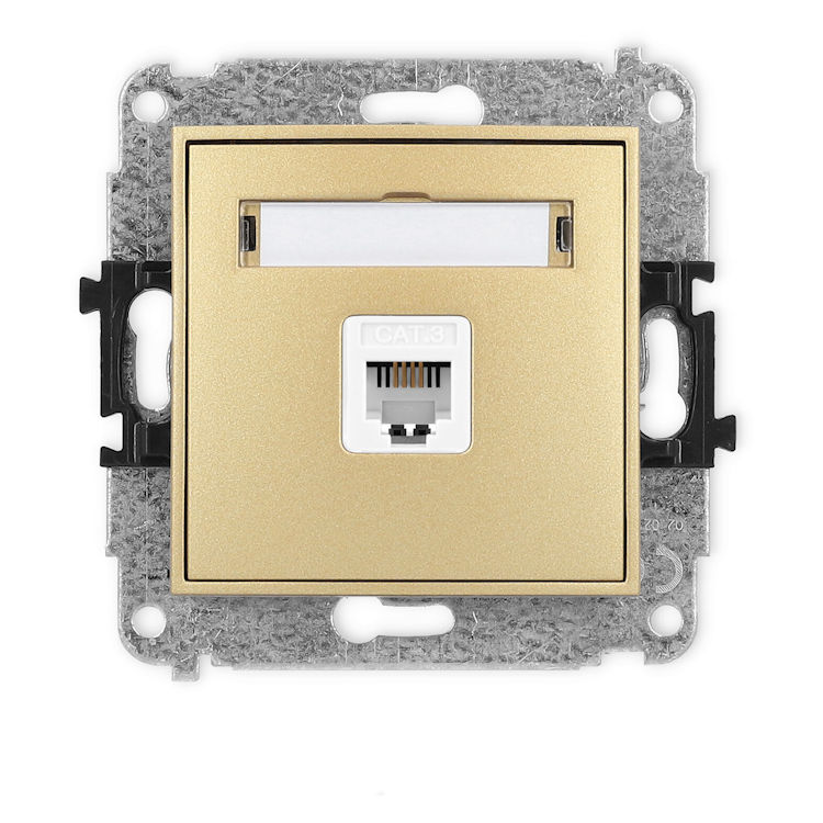 Mechanizm gniazda telefonicznego pojedynczego 1xRJ11, 4-stykowy, beznarzędziowe w kolorze Złotym to gniazdo przeznaczone do podłączenia przewodu telefonicznego zakończonego wtykiem RJ11. Umożliwia korzystanie ze stacjonarnego telefonu lub urządzeń wymagających takiego złącza. Montaż jest beznarzędziowy, co oznacza, że przewody można podłączyć łatwo i szybko bez użycia specjalistycznych narzędzi.
