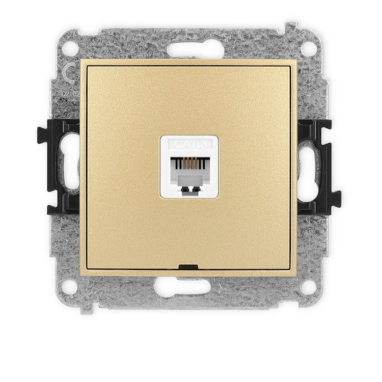 Mechanizm gniazda telefonicznego pojedynczego 1xRJ11, 4-stykowy, beznarzędziowe, bez pola opisowego w kolorze Złotym to gniazdo przeznaczone do podłączenia przewodu telefonicznego zakończonego wtykiem RJ11. Umożliwia korzystanie ze stacjonarnego telefonu lub urządzeń wymagających takiego złącza. Montaż jest beznarzędziowy, co oznacza, że przewody można podłączyć łatwo i szybko bez użycia specjalistycznych narzędzi.