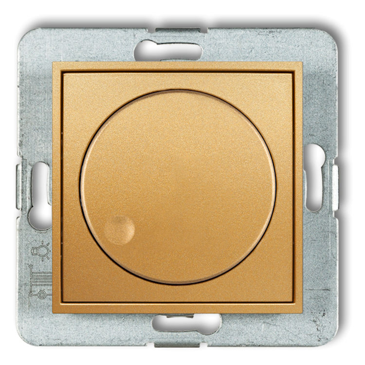Mechanizm elektronicznego regulatora oświetlenia przyciskowo-obrotowego do lamp LED w kolorze Złotym to elektroniczny regulator oświetlenia przyciskowo-obrotowy do lamp LED (ściemniacz) umożliwia regulację oświetlenia ściemnialnego ledowego, halogenowego zasilanego poprzez transformator elektroniczny oraz żarowego. Zastosowanie regulatora zwiększa komfort i codzienną oszczędność energii elektrycznej, której zużycie jest proporcjonalne do natężenia światła. Elektroniczny regulator oświetlenia przyciskowo-obrotowy do lamp LED jest urządzeniem inteligentnym, które można zaprogramować, ustawiając indywidualnie wg potrzeb minimalny poziom oświetlenia oraz tryb pracy.