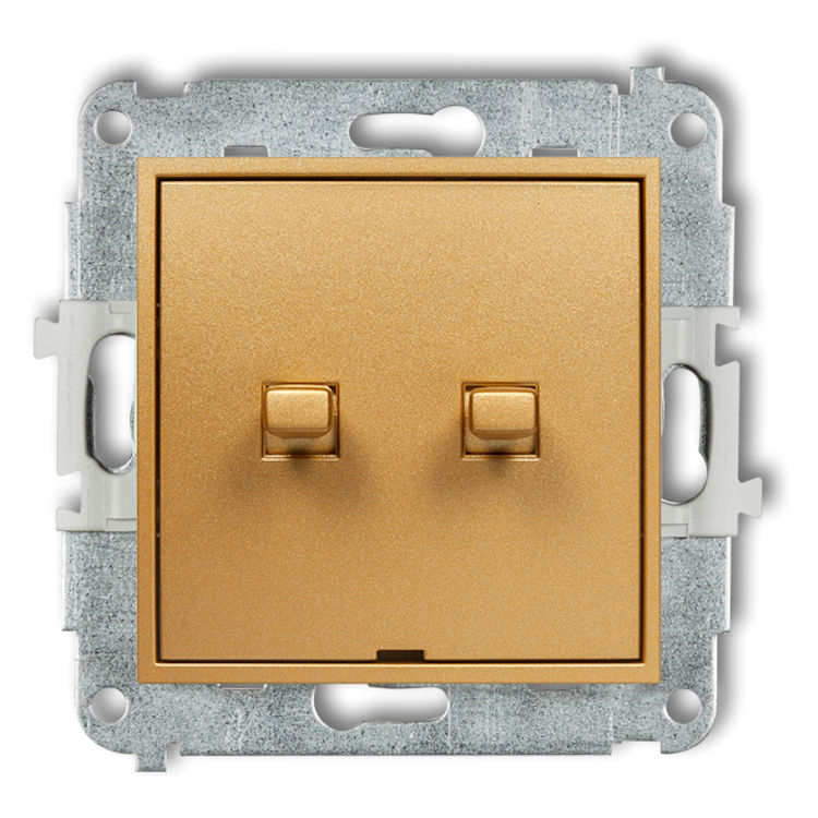 Mechanizm łącznika świecznikowego w stylu amerykańskim w kolorze Złotym to łącznik w stylu amerykańskim z dwoma klawiszami, który pozwala sterować dwoma źródłami światła w jednym pomieszczeniu. Można zapalić jedno światło, oba jednocześnie albo całkowicie je wyłączyć. Dzięki temu łatwo dopasować poziom oświetlenia do aktualnych potrzeb, a sam mechanizm różni się od tradycyjnego głównie wyglądem.