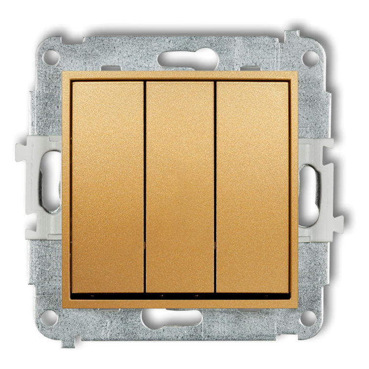 Mechanizm łącznika potrójnego w kolorze Złotym to mechanizm łącznika potrójnego, pozwalający na sterowanie trzema niezależnymi źródłami światła z jednego miejsca. Każdy z trzech klawiszy odpowiada za oddzielny obwód, co zapewnia pełną kontrolę nad oświetleniem w pomieszczeniu. W praktyce oznacza to oszczędność miejsca i wygodę, bo zamiast kilku oddzielnych przełączników wystarczy jeden mechanizm obsługujący trzy funkcje.