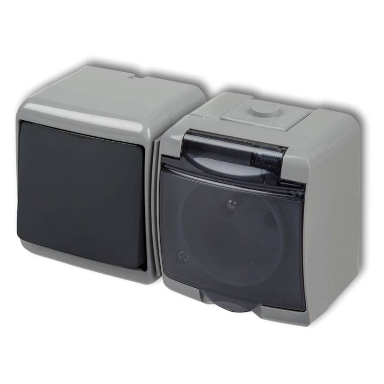 Połączenie łącznika jednobiegunowego z pojedynczym gniazdem z uziemieniem, które pozwala w jednym miejscu sterować oświetleniem i zasilać urządzenie elektryczne. Wyposażone jest w dymną klapkę ochronną oraz przesłony torów prądowych, które zwiększają bezpieczeństwo użytkowania.