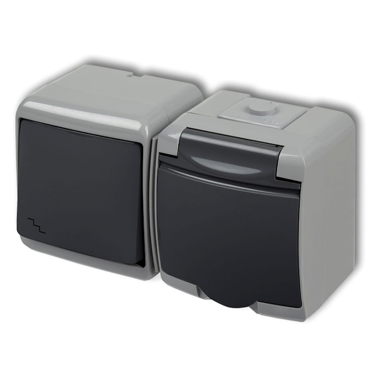 Połączenie łącznika schodowego z pojedynczym gniazdem z uziemieniem, które umożliwia sterowanie jednym źródłem światła z dwóch różnych miejsc oraz jednoczesne podłączenie urządzenia elektrycznego. Wyposażone jest w białą klapkę ochronną, zabezpieczającą przed kurzem i przypadkowym dotknięciem styków.