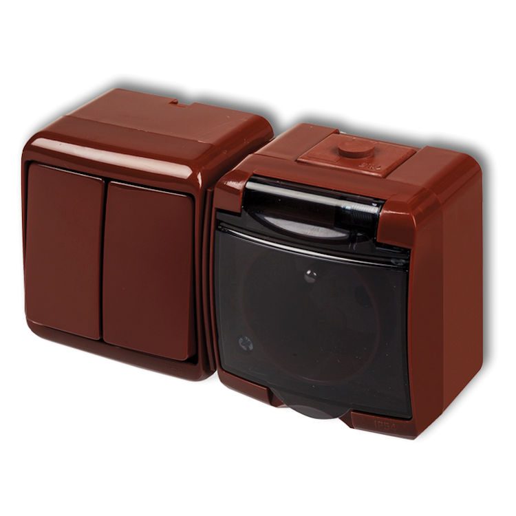 Połączenie łącznika świecznikowego z pojedynczym gniazdem z uziemieniem, które pozwala sterować dwoma źródłami światła oraz zasilać urządzenie elektryczne w jednym miejscu. Wyposażone jest w dymną klapkę ochronną oraz przesłony torów prądowych, które zwiększają bezpieczeństwo użytkowania.