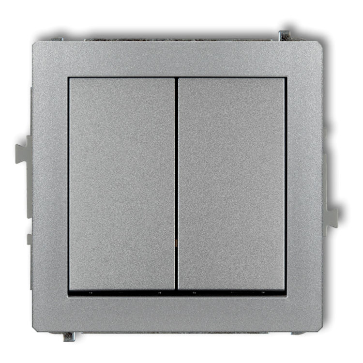 Mechanizm łącznika jednobiegunowego ze schodowym (dwa klawisze bez piktogramów, wspólne zasilanie) w kolorze Srebrnym Metalik to mechanizm łącznika, który łączy w sobie funkcję zwykłego włącznika światła oraz schodowego. Dzięki temu można sterować jednym źródłem oświetlenia z dwóch różnych miejsc, na przykład z dołu i góry schodów. Rozwiązanie to zapewnia wygodę w codziennym użytkowaniu i oszczędność miejsca, ponieważ jeden mechanizm spełnia dwie role.