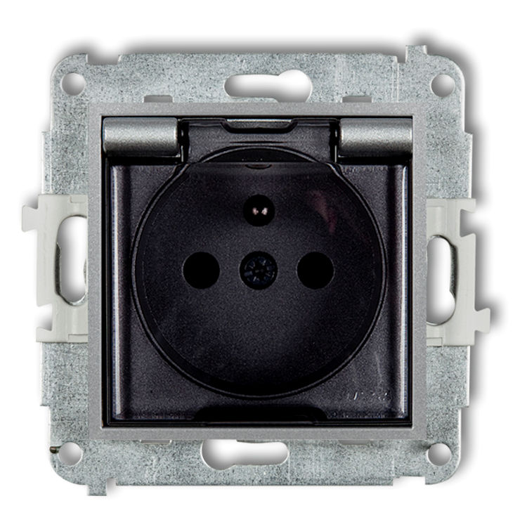 Pojedyncze gniazdo elektryczne z uziemieniem, wyposażone w klapkę w kolorze dymnym, która chroni je przed zachlapaniem wodą. Dzięki temu można je bezpiecznie stosować w pomieszczeniach narażonych na wilgoć, takich jak łazienka, kuchnia czy garaż. Dodatkowe przesłony torów prądowych zasłaniają otwory, gdy gniazdo nie jest używane.