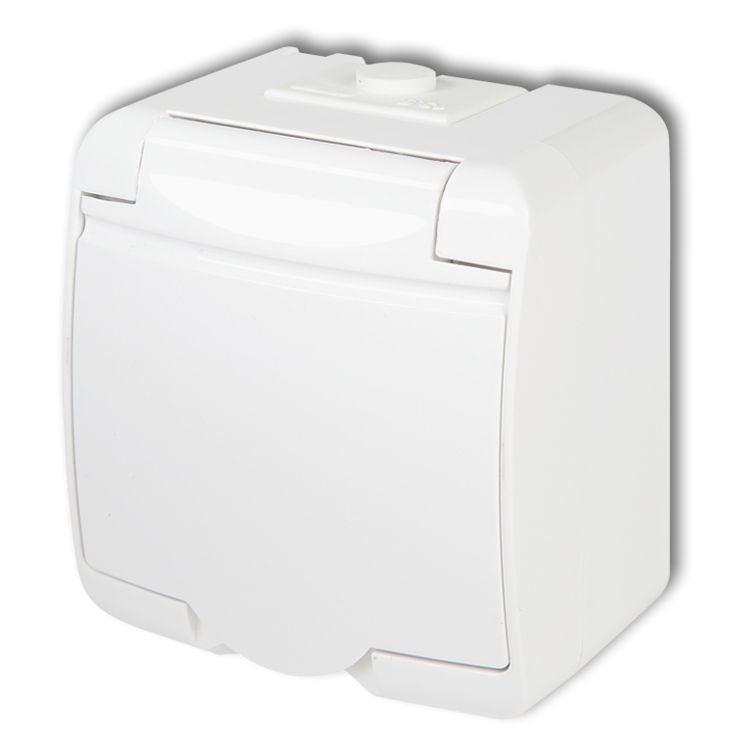 Pojedyncze gniazdo z uziemieniem, wyposażone w białą klapkę ochronną oraz przesłony torów prądowych. Zapewnia bezpieczne podłączenie urządzeń elektrycznych do sieci, chroniąc przed przypadkowym kontaktem ze stykami. Dzięki przesłonom zwiększa bezpieczeństwo użytkowania, szczególnie w pomieszczeniach, gdzie przebywają dzieci.